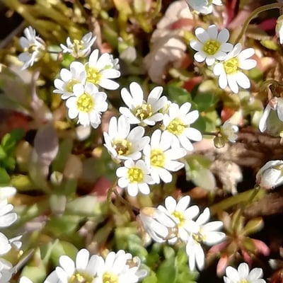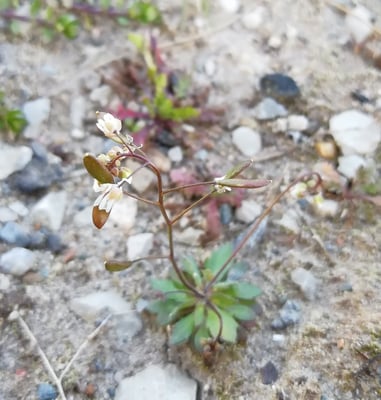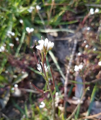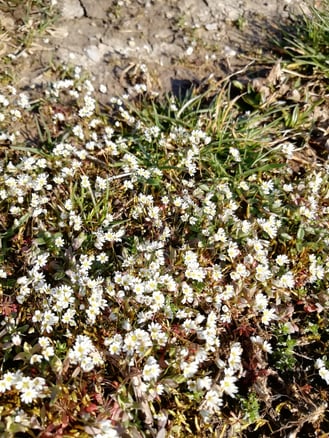 Ein früher Frühblüher der gerne übersehen wird, ist das Frühlings-Hungerblümchen (Draba verna). Fällt jedoch meistens trotzdem auf, weil es früh blühend auf mageren Böden oftmals dichte Teppiche bildet. Es ist eine der häufigsten Kreuzblütengewächse Mitteleuropas. Die Pflanze ist einjährig, 5 bis 15 cm groß, mit aufrechtem, unverzweigtem Stengel. Die Blüten erscheinen schon ab Ende Vorfrühling, meist März bis April, und bestäuben sich meist selbst. Der Insektenbesuch ist spärlich, Wildbienen kommen als Bestäuber vor. Die weißen Blüten stehen in lockeren Trauben an einem blattlosen Blütenstiel, der aus der Blatt-Rosette herauswächst. Die 4 Blütenblätter sind tief, fast bis zum Blütenboden geschlitzt. Die Schötchen sind breit elliptisch bis rund, kahl mit etwa 5-35 Samen.