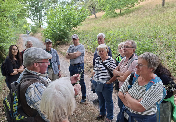 Weiter ging es durch Streuobstwiesen, an Ackerminze, Baldrian und Esskastanie vorbei. Des öfteren wurden bei Unklarheiten die mitgeführten Bestimmungsbücher zu Rate gezogen. Die Esskastanien