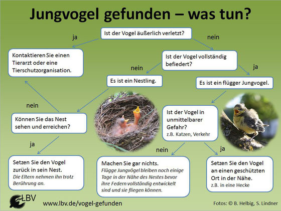 Verloren gegangene Jungvögel werden bis zu 24 Stunden lang von ihren Eltern gesucht. Keine Angst: Auch ein kurz aufgenommener Jungvogel kann ohne Probleme wieder zurück in eine Astgabel am Fundort gesetzt werden.