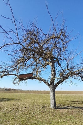 Eine ganze Reihe der Halbmondpendelkästen hängen, auch andere, vermehrt dort wo unsere wenigen Käuze vorkommen, auch an den Landkreis- grenzen zu Würzburg und Kitzingen, einer sogar knapp über der Landkreisgrenze. Im Spätsommer/Herbst 2023 wurden ebenfalls Kästen angebracht. Alle Kästen sind, soweit nötig, von z.B. Starennestern oder Hornissenwaben befreit und stehen dem Steinkauz offen. Es ist leider nicht gelungen noch mehr Röhren auszubringen.