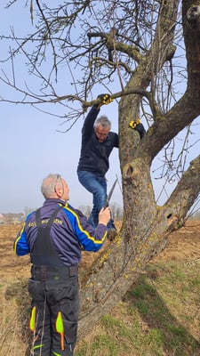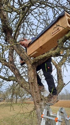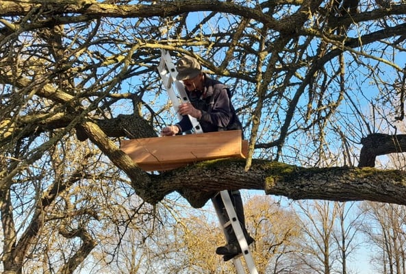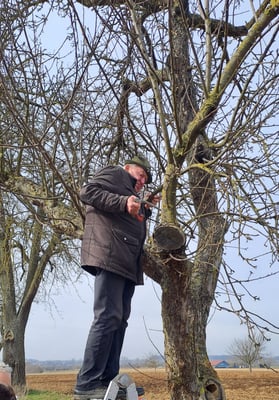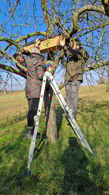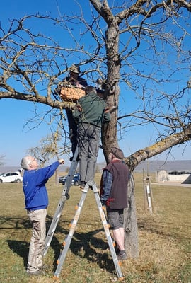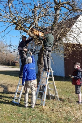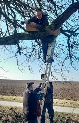 Mitglieder unseres Steinkauzteams, sowie der Ehrenvorsitzende Herbert Klein, beim Aufhängen einiger Steinkauz-Nistkästen (Februar 2025)
